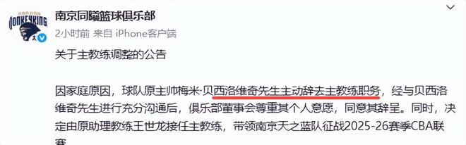 12月9日下午,南京同曦篮球俱乐部官宣换帅,因家庭原因,贝西洛维奇主动辞去主教练职务,决定由原助理教练王世龙接任主教练,带领南京天之蓝队征战2025-26赛季CBA联赛。